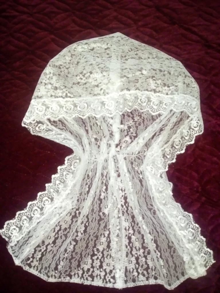 Капор ритуальный гипюр, отделка кружевом